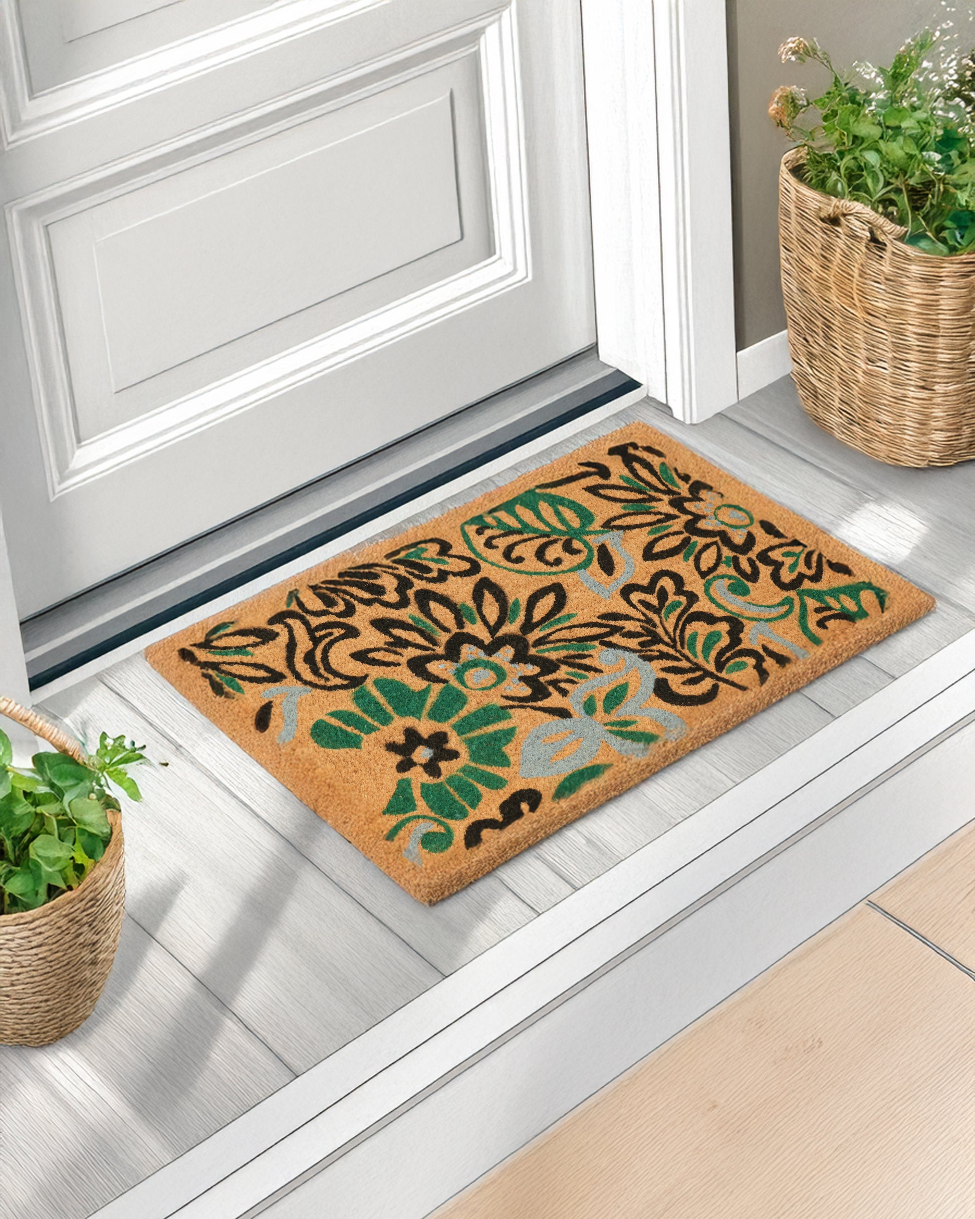 Green and Black Flowers Printed Coir Door Mat