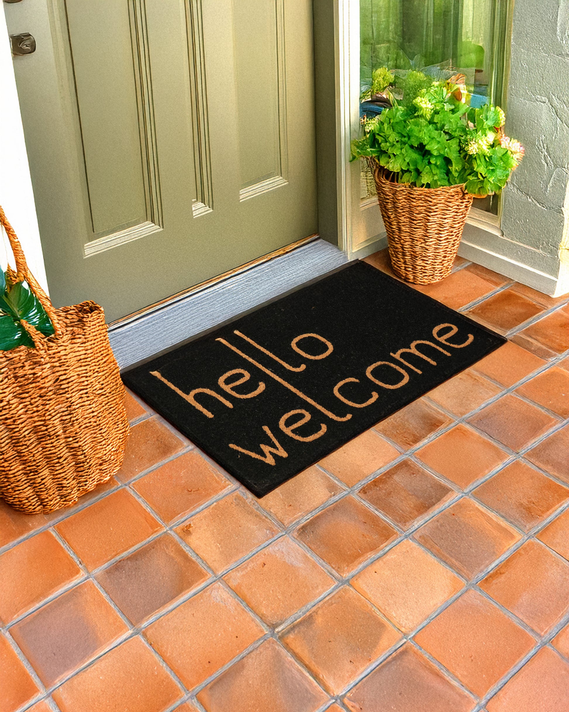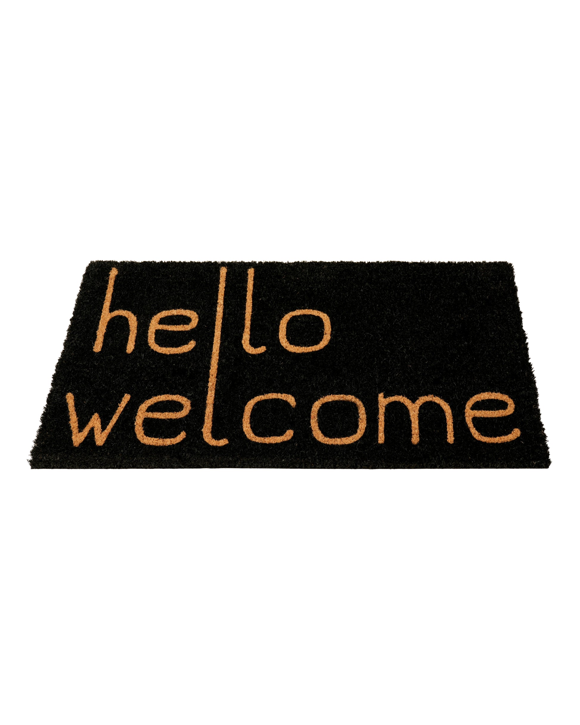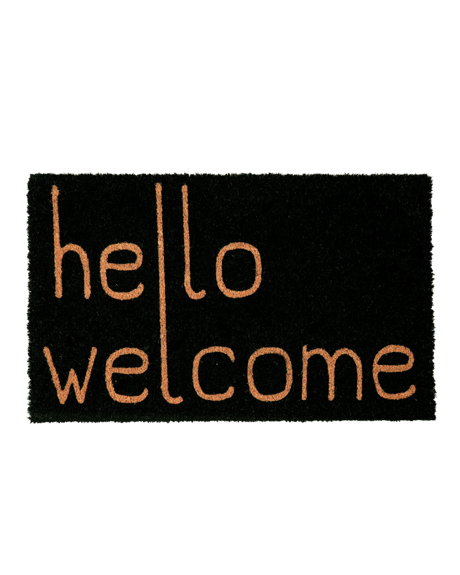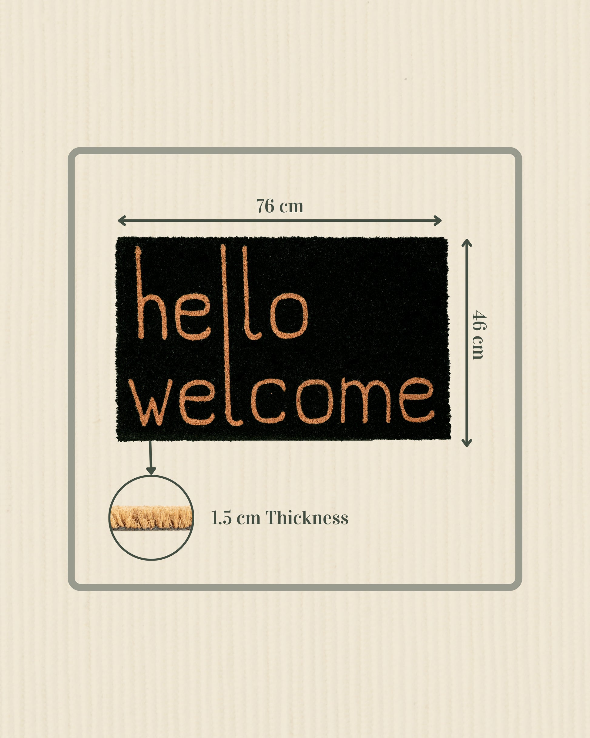 Make a stylish first impression with the Hello Welcome with Black Background Printed Coir Door Mat by Matboy. Featuring a bold black backdrop with a warm "Hello Welcome" message, this mat adds a modern and sophisticated touch to any doorstep. Crafted from natural coir, it effectively traps dirt while enhancing your home’s decor.