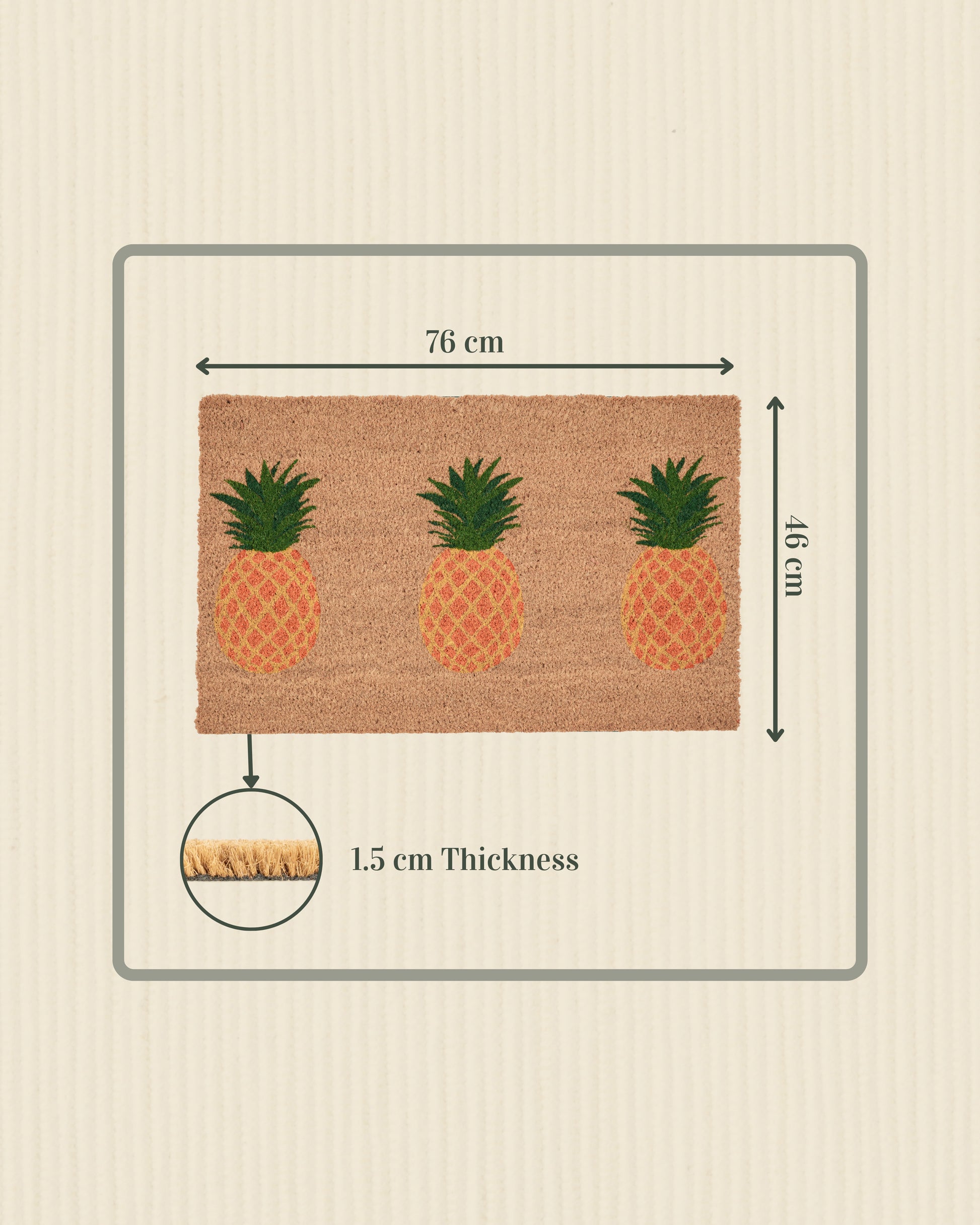 Add a tropical touch to your doorstep with the Three Pineapples Printed Coir Door Mat by Matboy. Featuring a vibrant design of three pineapples, this mat brings a fun, warm, and welcoming vibe to any entryway. Made from natural coir, it effectively traps dirt while enhancing your homeβs decor.